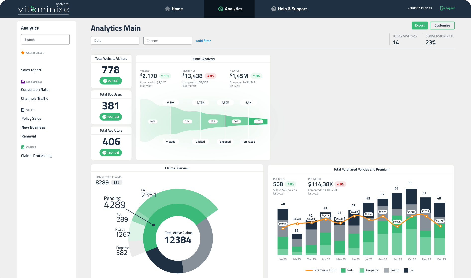 Vitaminise Data Analytics is a data visualization solution for insurance companies. Capture and analyze data ingested from Vitaminise Mobile App, Chatbot, Web Portal, and Customer Feedback Tool to track metrics on sales, claims, and customers. With this information, you will be able to optimize your up/cross-selling strategies and understand where most of your sales and marketing efforts should be targeted.